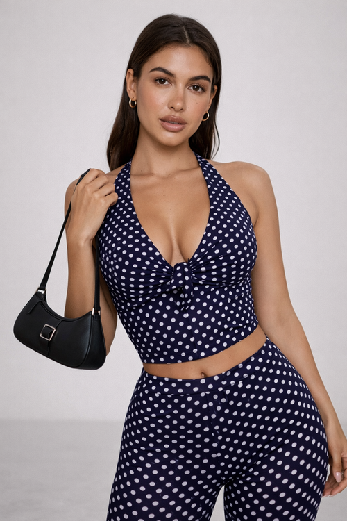 NOVA | Women’s Brown Polka Dot Halter Mini Dress – Deep V Neck Summer Party Dress